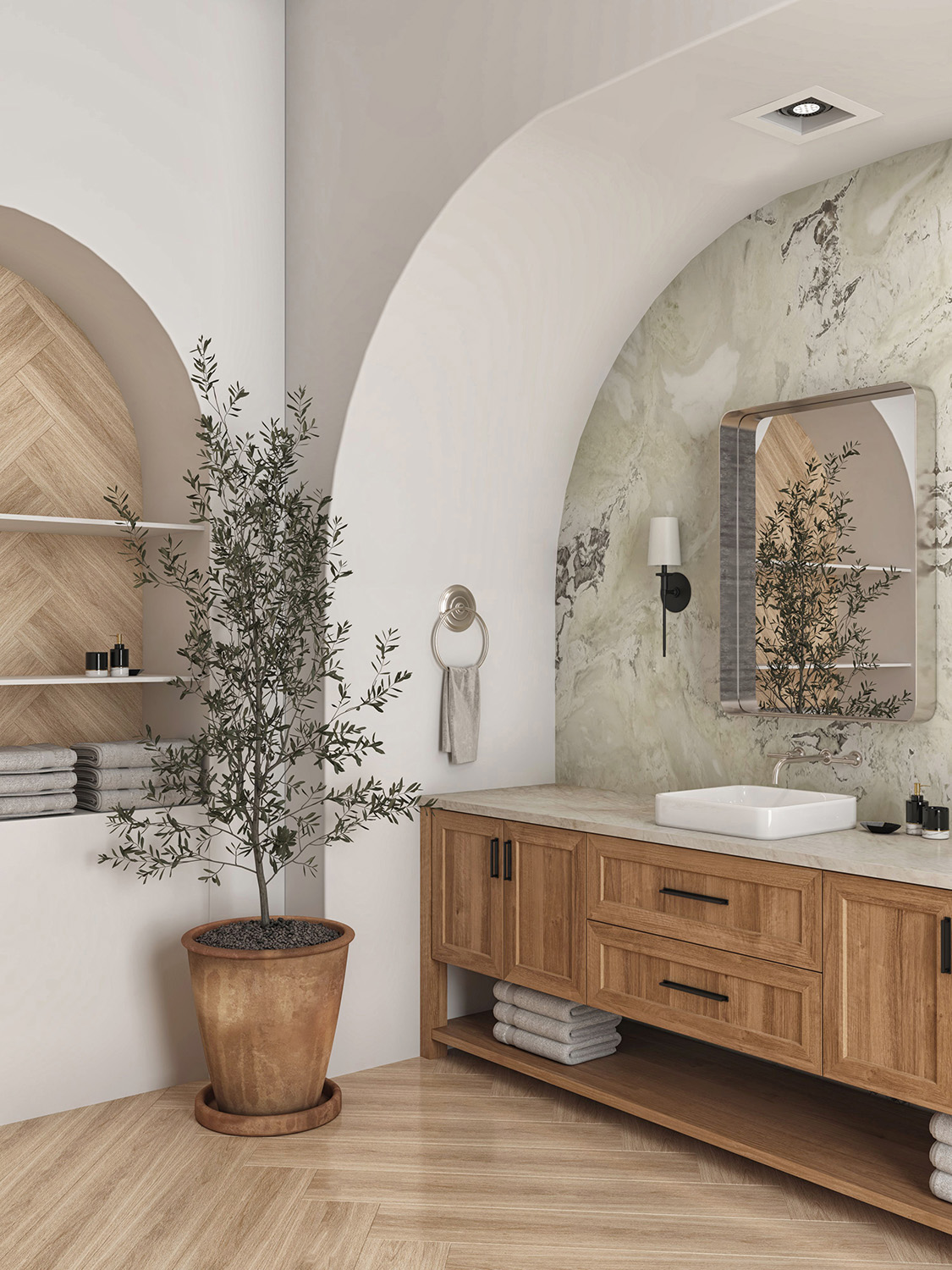 Nativo illustrates thoughtful design and material choice in its refined simplicity. The clean lines and muted tones of the porcelain complement the rich textured of wood, achieving a collection that is timeless and sophisticated.