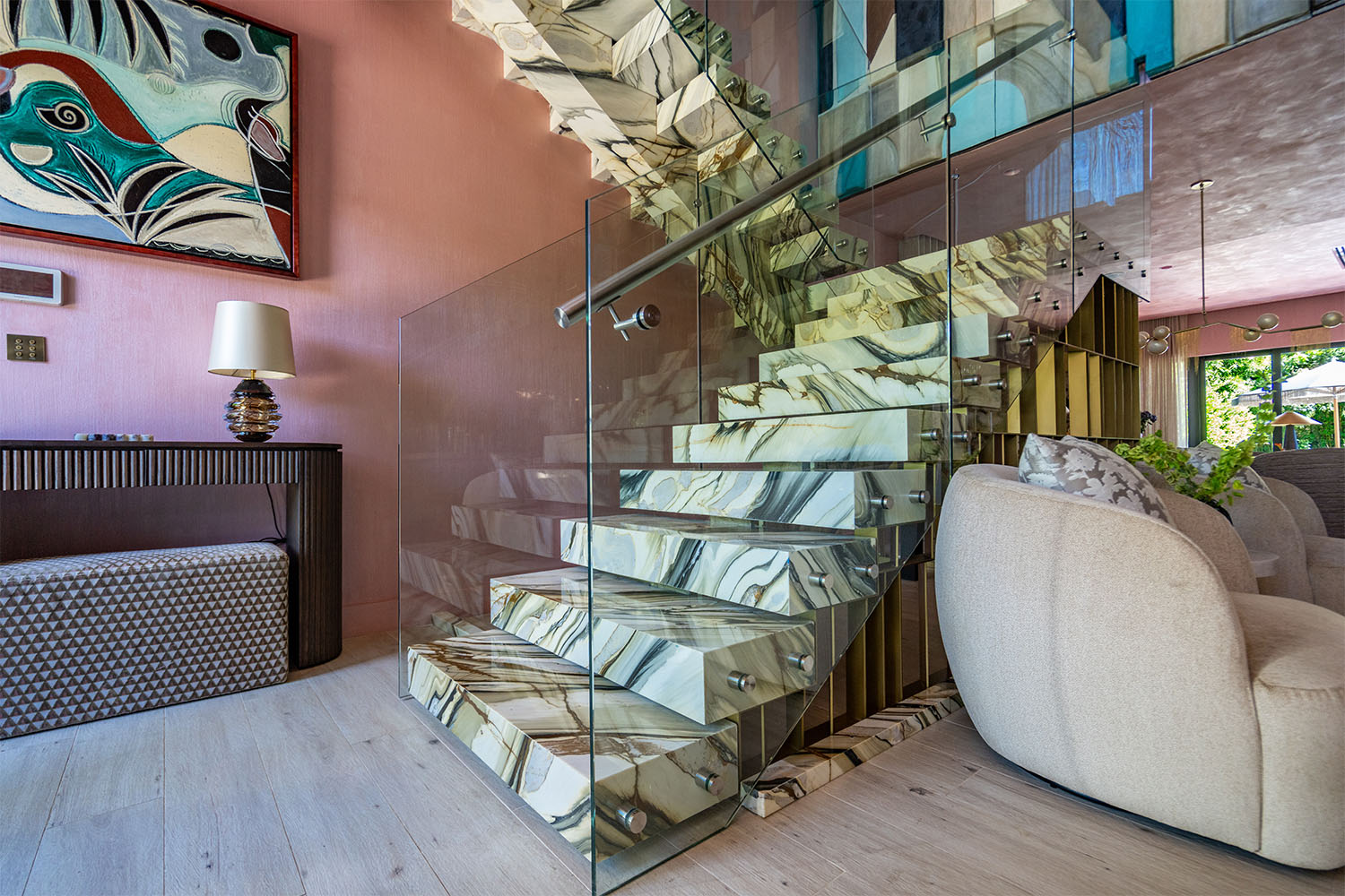 The stairwell sets the tone for the entire home: grand, sculptural, and undeniably theatrical. Crafted from Calacatta Illusion Polished Marble, each tread feels like a curated slice of luxury.