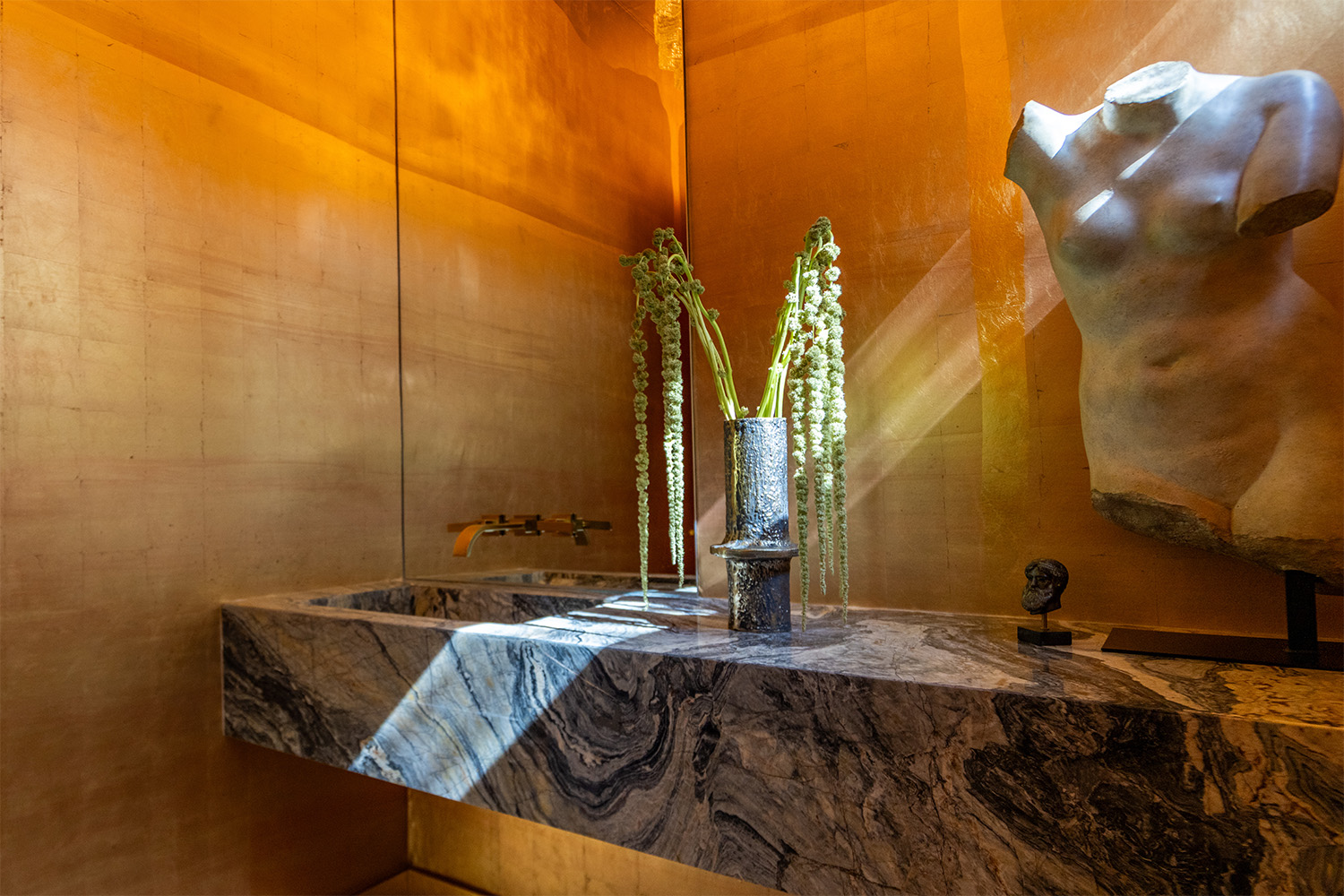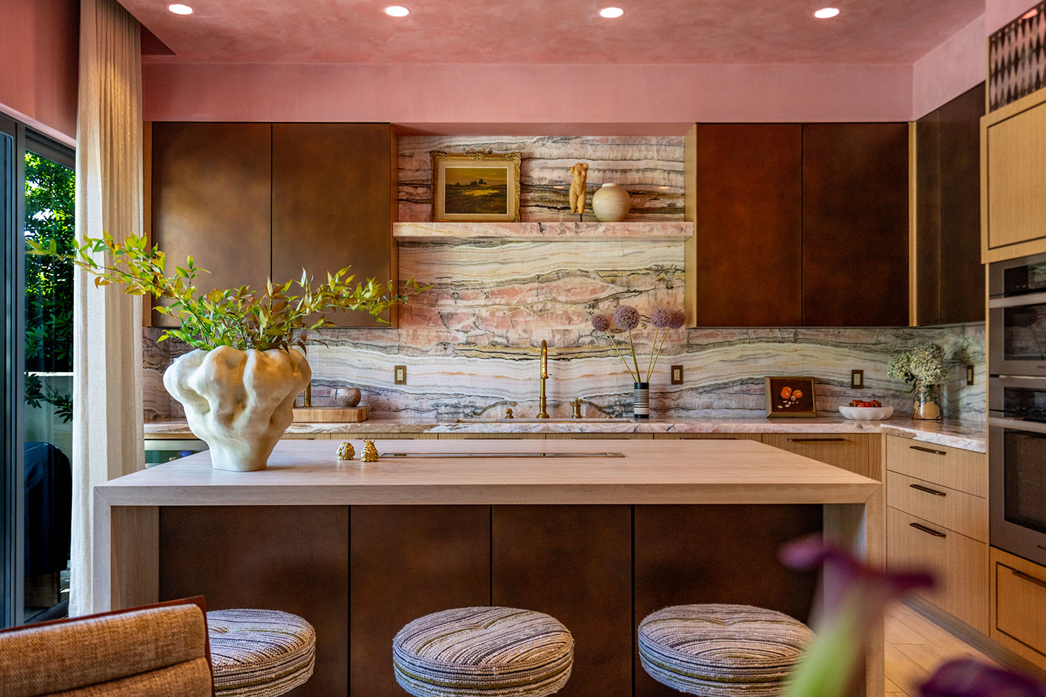 Forget subtle – this guest bath is pure spectacle. Drenched in Cipollino Rosso Ondulato Marble from wall to vanity, it doesn’t hint at drama; it dials it all the way up. It’s textured, tonal, and totally fearless. Step in, and try not to stare.