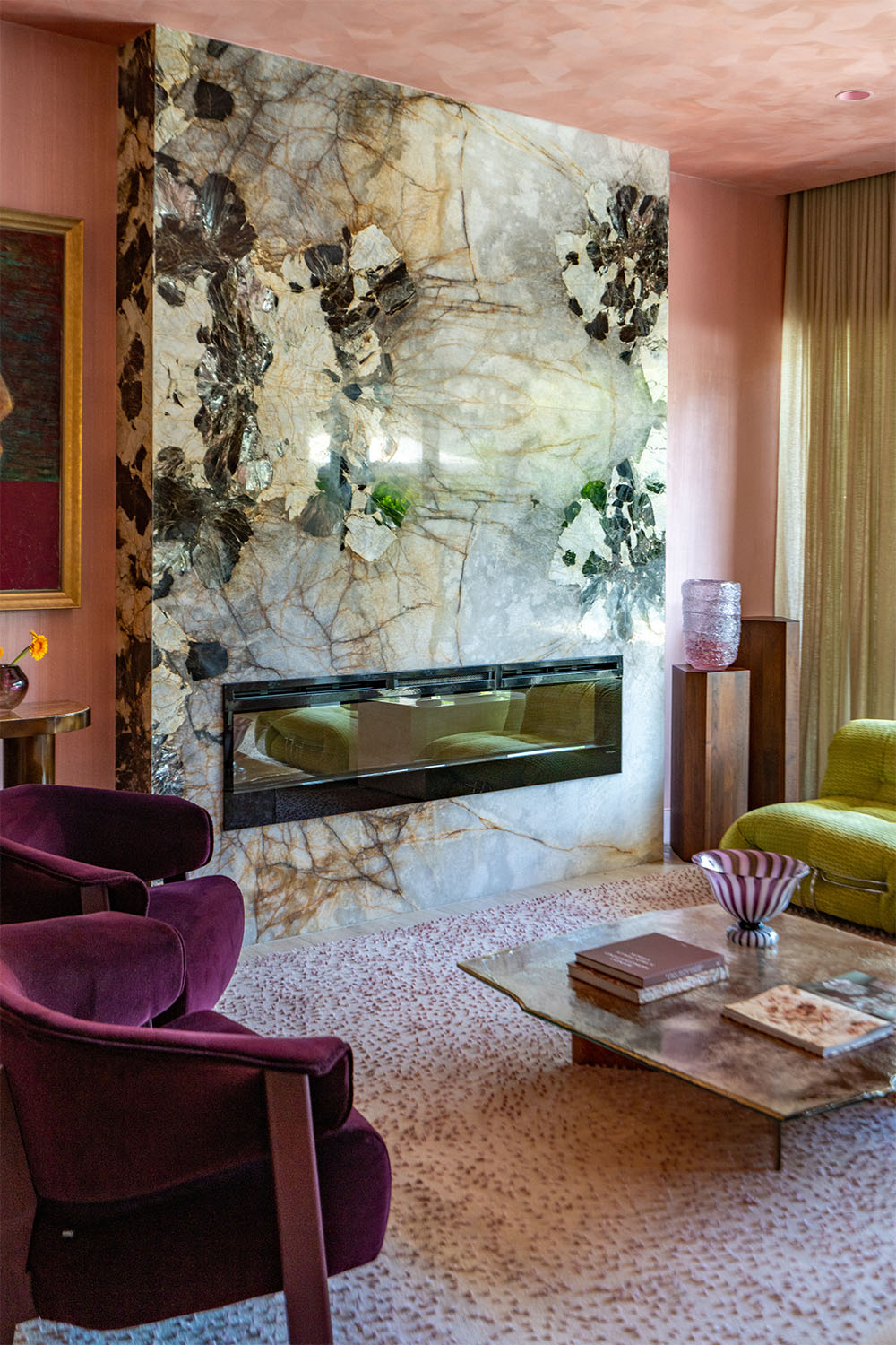 With its deep violets and electric crystal veining, the stone demands attention, anchoring a room filled with plush textures, metallic accents, and soft blush tones.